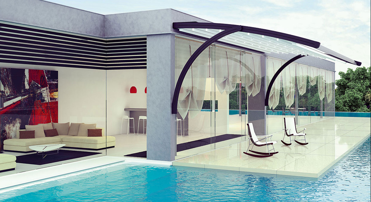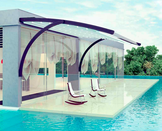 挑檐式電動遮篷 寬度: 1000~4500mm 伸縮長度: 1000~4500mm 下部弧形支撐 上部弧形天幕簾