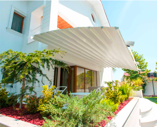 挑檐式電動遮篷 寬度: 1000~4500mm 伸縮長度: 1000~4500mm 下部弧形支撐 上部水平天幕簾
